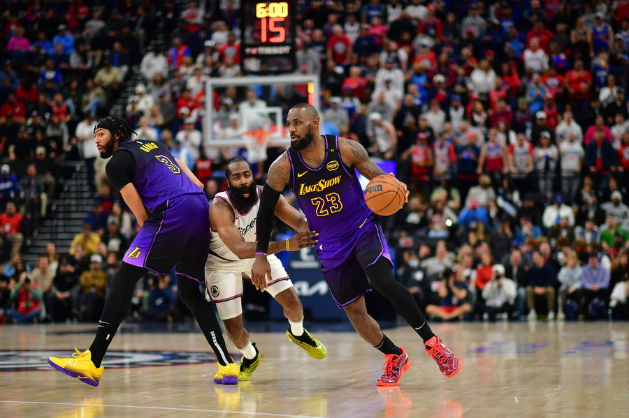 Jan 19, 2025; Inglewood, California, USA; Los Angeles Lakers forward LeBron James (23) moves the ball as forward Anthony Davis (3) provides coverage against Los Angeles Clippers guard James Harden (1) during the second half at Intuit Dome. Mandatory Credit: Gary A. Vasquez-Imagn Images