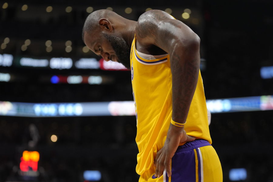 Nov 1, 2024; Toronto, Ontario, CAN; Los Angeles Lakers forward LeBron James (23) during a break in the action against the Toronto Raptors during the second half at Scotiabank Arena. Mandatory Credit: John E. Sokolowski-Imagn Images