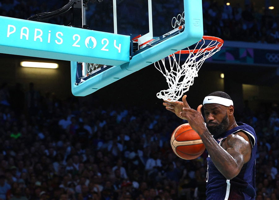 Paris 2024 Olympics – Basketball – Men’s Group Phase – Group C – Puerto Rico vs United States – Lille, Pierre Mauroy Stadium, Villeneve-d’Ascq, France – August 03, 2024. Lebron James of United States scores a basket REUTERS/Brian Snyder