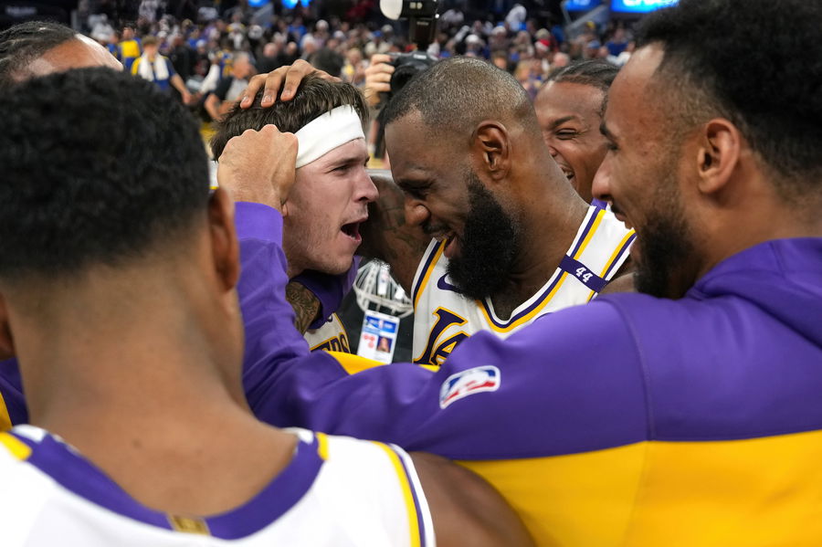 Dec 25, 2024; San Francisco, California, USA; Los Angeles Lakers guard Austin Reaves (center left) is congratulated by forward LeBron James (center right) after making the game-winning basket to defeat the Golden State Warriors at Chase Center. Mandatory Credit: Darren Yamashita-Imagn Images