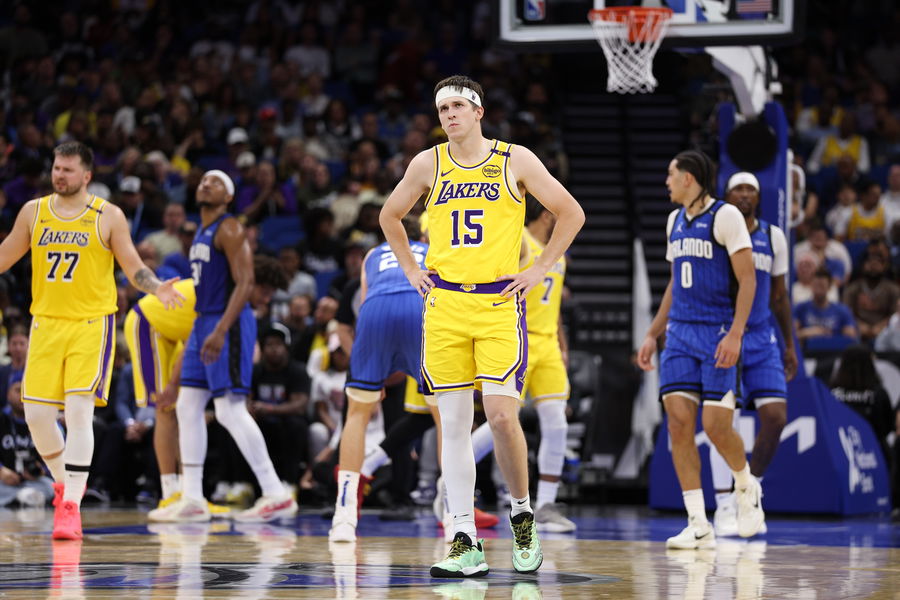 Mar 24, 2025; Orlando, Florida, USA; Los Angeles Lakers guard Austin Reaves (15) reacts after a play against the Orlando Magic in the second quarter at Kia Center. Mandatory Credit: Nathan Ray Seebeck-Imagn Images