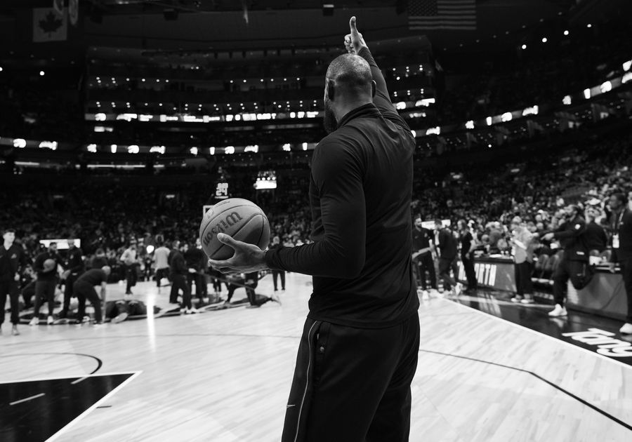 Apr 2, 2024; Toronto, Ontario, CAN; Los Angeles Lakers forward LeBron James (23) gives the thumbs up during the pregame warmup before a game against the Toronto Raptors at Scotiabank Arena. Mandatory Credit: Nick Turchiaro-USA TODAY Sports
