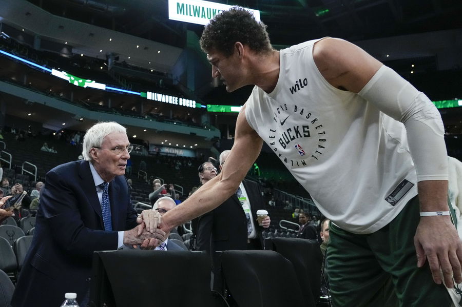 Feb 9, 2025; Milwaukee, Wisconsin, USA; ESPN broadcaster Hubie Brown talks with Milwaukee Bucks center Brook Lopez (11) prior to the game against the Philadelphia 76ers at Fiserv Forum. Mandatory Credit: Jeff Hanisch-Imagn Images