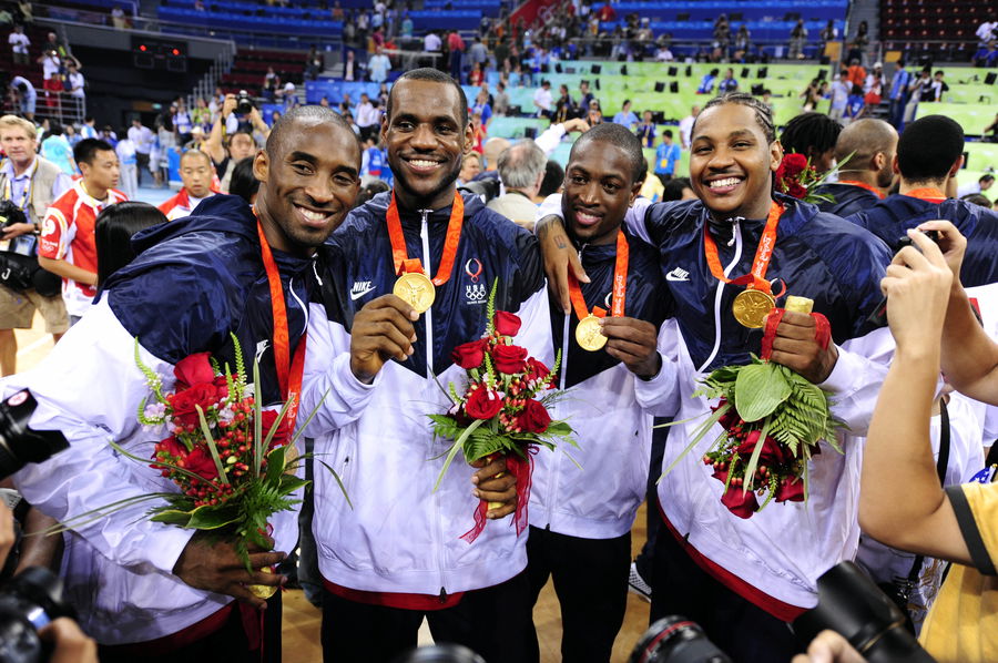 Aug 24, 2008; Beijing, CHINA; USA players Kobe Bryant (left), Lebron James (second left), Dwyane Wade (second right), and Carmelo Anthony pose with their gold medals following the mens basketball gold medal game against Spain at the Beijing Olympic Basketball Gymnasium during the 2008 Beijing Olympic Games. USA beat Spain 118-107 to win the gold medal. Mandatory Credit: Bob Donnan-USA TODAY Sports