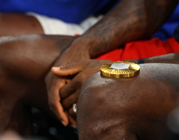 Paris 2024 Olympics – Basketball – Women’s Gold Medal Game – France vs United States – Bercy Arena, Paris, France – August 11, 2024. Lebron James’ gold medal rested on his knee. REUTERS/Brian Snyder TPX IMAGES OF THE DAY