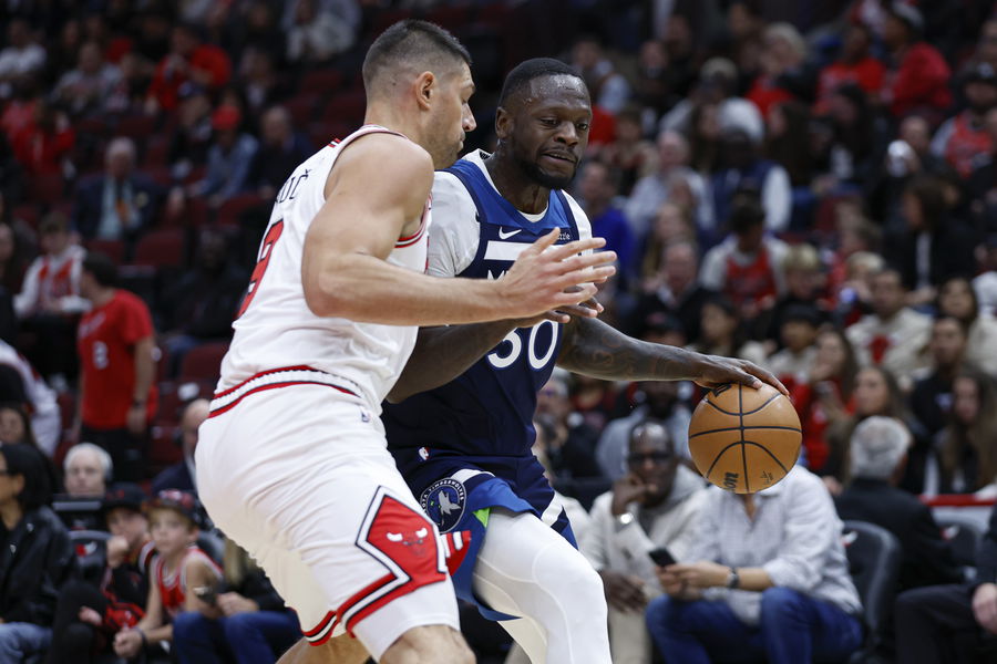 Oct 16, 2024; Chicago, Illinois, USA; Minnesota Timberwolves forward Julius Randle (30) is defended by Chicago Bulls center Nikola Vucevic (9) during the first half at United Center. Mandatory Credit: Kamil Krzaczynski-Imagn Images
