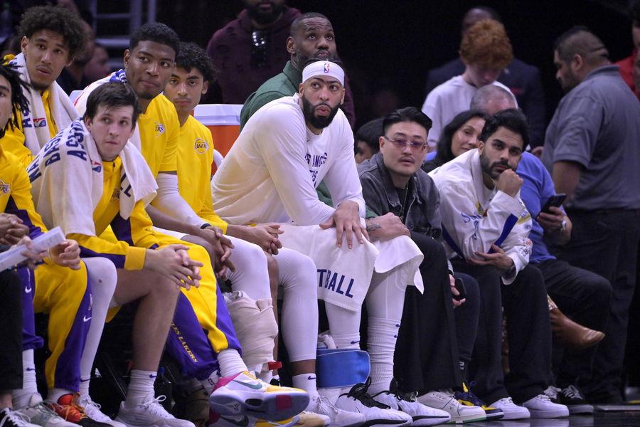 Jan 23, 2024; Los Angeles, California, USA; Los Angeles Lakers guard Jalen Hood-Schifino (0) and guard Austin Reaves (15) and forward Rui Hachimura (28) and guard Max Christie (10) forward Anthony Davis (3) and forward LeBron James (23) look on from the bench in the second half against the Los Angeles Clippers at Crypto.com Arena. Mandatory Credit: Jayne Kamin-Oncea-USA TODAY Sports
