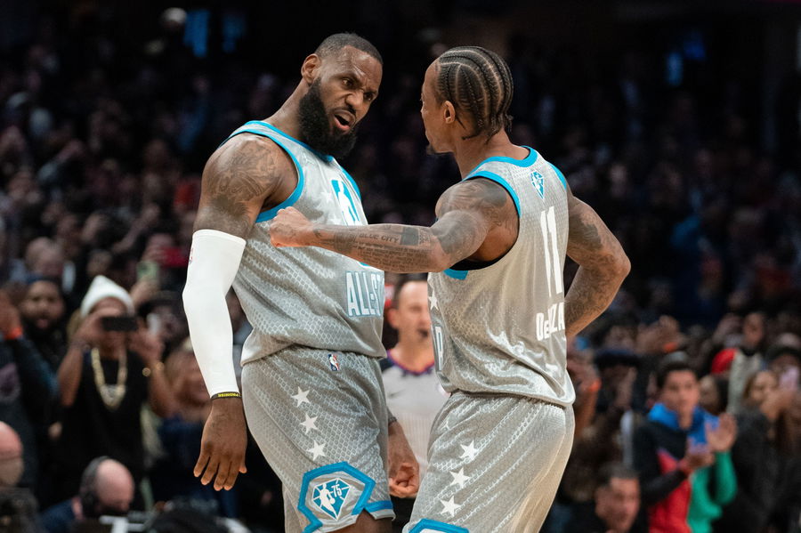February 20, 2022; Cleveland, Ohio, USA; Team LeBron forward LeBron James of the Los Angeles Lakers (6) celebrates with Team LeBron guard/forward DeMar DeRozan of the Chicago Bulls (11) after making the game-winning basket during the fourth quarter in the 2022 NBA All-Star Game at Rocket Mortgage FieldHouse. Mandatory Credit: Kyle Terada-USA TODAY Sports
