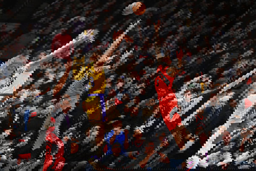 Dec 4, 2025; Toronto, Ontario, CAN; Los Angeles Lakers forward Rui Hachimura (28) shoots the game winning basket at the buzzer past Toronto Raptors forward Brandon Ingram (3) in the second half at Scotiabank Arena. Mandatory Credit: Dan Hamilton-Imagn Images