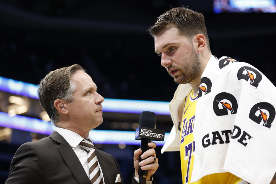 Nov 10, 2025; Charlotte, North Carolina, USA; Los Angeles Lakers forward/guard Luka Doncic (77) is interviewed following the game against the Charlotte Hornets at Spectrum Center. Mandatory Credit: Brian Westerholt-Imagn Images