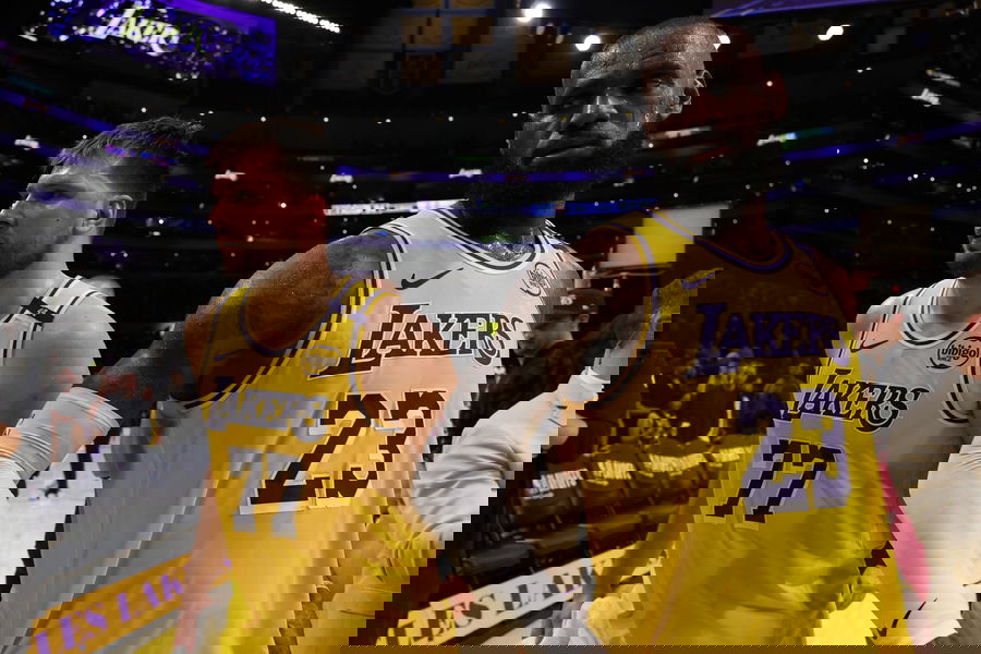 Apr 22, 2025; Los Angeles, California, USA; Los Angeles Lakers guard Luka Doncic (77) and Los Angeles Lakers forward LeBron James (23) leave a court after defeating the Minnesota Timberwolves 94-85 in game two of first round for the 2024 NBA Playoffs at Crypto.com Arena. Mandatory Credit: Kiyoshi Mio-Imagn Images