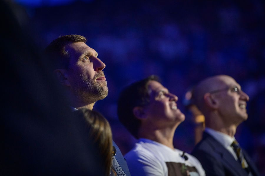 Jan 5, 2022; Dallas, Texas, USA; (from left) Former Dallas Mavericks player Dirk Nowitzki and owner Mark Cuban and NBA commissioner Adam Silver watch video highlights during the ceremony to retire NowitzkiÕs number 41 after the game between the Dallas Mavericks and the Golden State Warriors at the American Airlines Center. Mandatory Credit: Jerome Miron-USA TODAY Sports