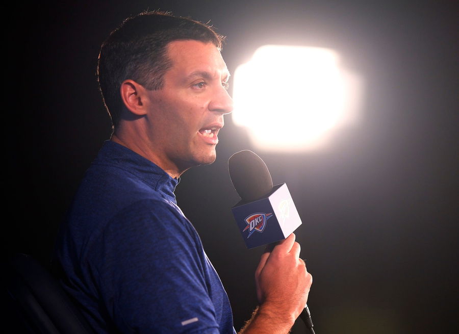 Head coach Mark Daigneault talks with the Thunder broadcast crew.Thunder media day ay the Paycom Center Monday, Sept. 30, 2024.
