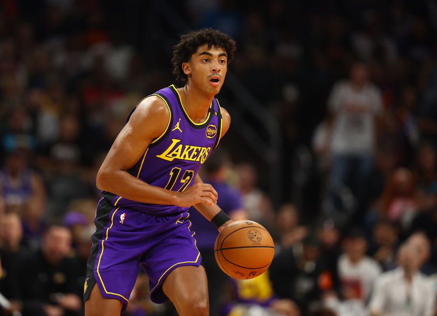 Oct 28, 2024; Phoenix, Arizona, USA; Los Angeles Lakers guard Max Christie (12) against the Phoenix Suns at Footprint Center. Mandatory Credit: Mark J. Rebilas-Imagn Images