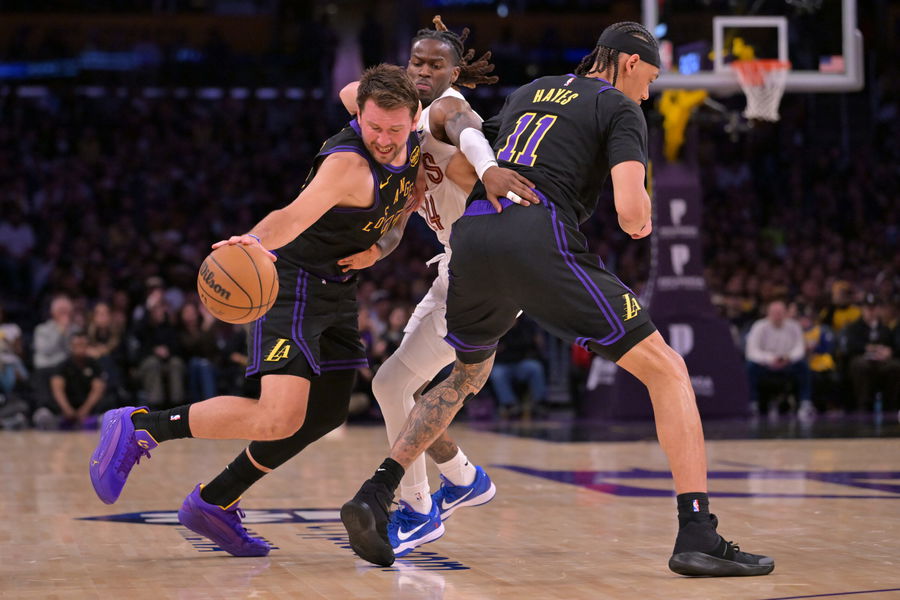 Mar 31, 2026; Los Angeles, California, USA; Los Angeles Lakers center Jaxson Hayes (11) screens Cleveland Cavaliers guard Keon Ellis (14) as Los Angeles Lakers guard Luka Doncic (77) drives to the basket in the first half at Crypto.com Arena. Mandatory Credit: Jayne Kamin-Oncea-Imagn Images