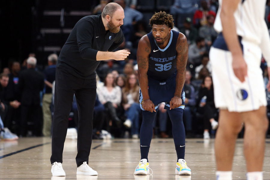 Oct 30, 2023; Memphis, Tennessee, USA; Memphis Grizzlies head coach Taylor Jenkins talks with guard Marcus Smart (36) during the second half against the Dallas Mavericks at FedExForum. Mandatory Credit: Petre Thomas-USA TODAY Sports