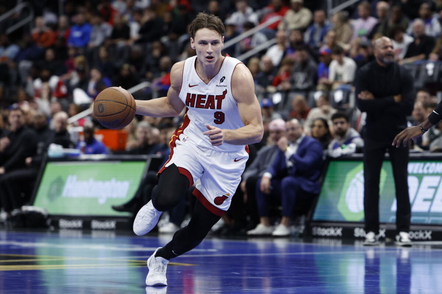 Nov 12, 2024; Detroit, Michigan, USA; Miami Heat guard Pelle Larsson (9) dribbles in the first half against the Detroit Pistons at Little Caesars Arena. Mandatory Credit: Rick Osentoski-Imagn Images