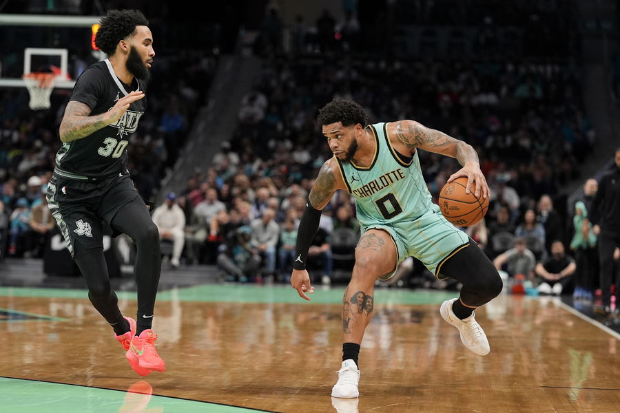 Feb 7, 2025; Charlotte, North Carolina, USA; Charlotte Hornets forward Miles Bridges (0) handles the ball defended by San Antonio Spurs forward Julian Champagnie (30) during the first quarter at Spectrum Center. Mandatory Credit: Jim Dedmon-Imagn Images
