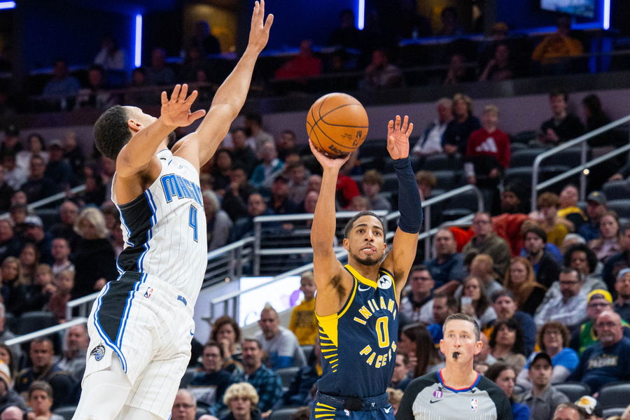 Nov 19, 2022; Indianapolis, Indiana, USA; Indiana Pacers guard Tyrese Haliburton (0) shoots the ball against Orlando Magic guard Jalen Suggs (4) in the second half at Gainbridge Fieldhouse. Mandatory Credit: Trevor Ruszkowski-USA TODAY Sports