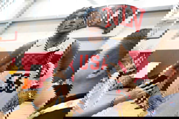 LAS VEGAS, NV – AUGUST 07: Myles Turner speaks with the media during the 2019 USA Basketball Men’s National Team Training Camp at Mendenhall Center on the University of Nevada, Las Vegas campus on August 07, 2019 in Las Vegas Nevada. NOTE TO USER: User expressly acknowledges and agrees that, by downloading and/or using this Photograph, user is consenting to the terms and conditions of the Getty Images License Agreement. Mandatory Copyright Notice: Copyright 2019 NBAE (Nathaniel S. Butler/NBAE via Getty Images)