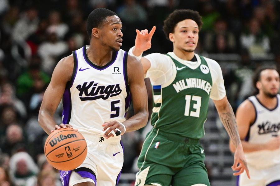 Jan 14, 2025; Milwaukee, Wisconsin, USA; Sacramento Kings guard De’Aaron Fox (5) controls the ball against Milwaukee Bucks guard Ryan Rollins (13) in the second quarter at Fiserv Forum. Mandatory Credit: Benny Sieu-Imagn Images