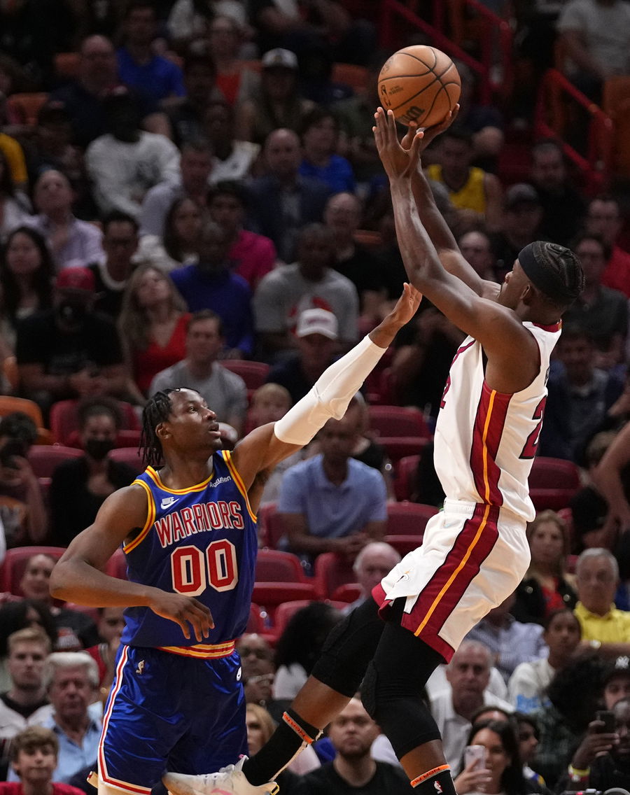 Mar 23, 2022; Miami, Florida, USA; Miami Heat forward Jimmy Butler (22) shoots over Golden State Warriors forward Jonathan Kuminga (00) during the second half at FTX Arena. Mandatory Credit: Jasen Vinlove-USA TODAY Sports