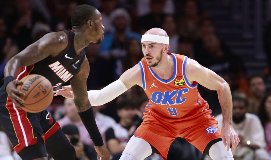 Dec 20, 2024; Miami, Florida, USA; Oklahoma City Thunder guard Alex Caruso (9) defends Miami Heat forward Haywood Highsmith (24) during the first half at Kaseya Center. Mandatory Credit: Rhona Wise-Imagn Images