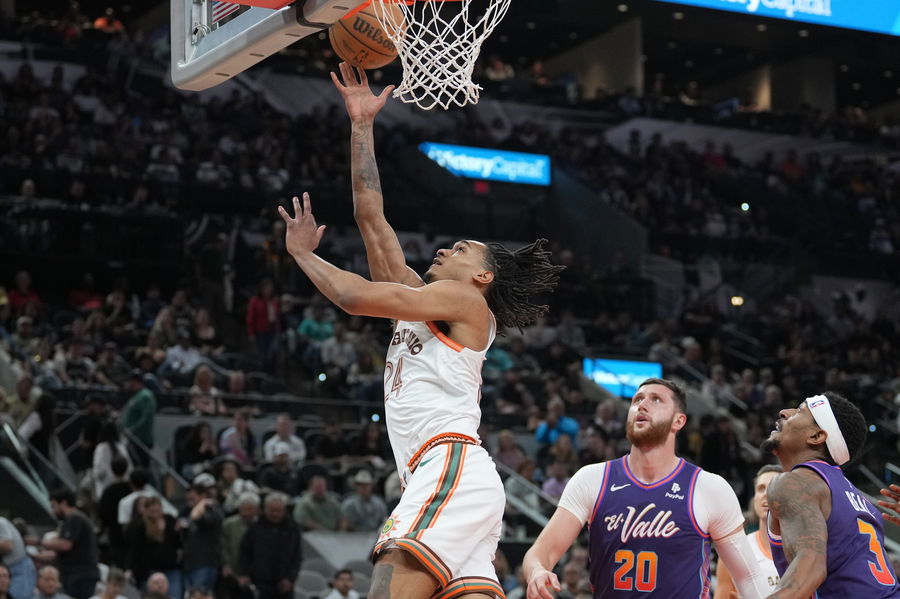 Mar 25, 2024; San Antonio, Texas, USA; San Antonio Spurs guard Devin Vassell (24) shoots in front of Phoenix Suns center Jusuf Nurkic (20) and guard Bradley Beal (3) in the first half at Frost Bank Center. Mandatory Credit: Daniel Dunn-USA TODAY Sports
