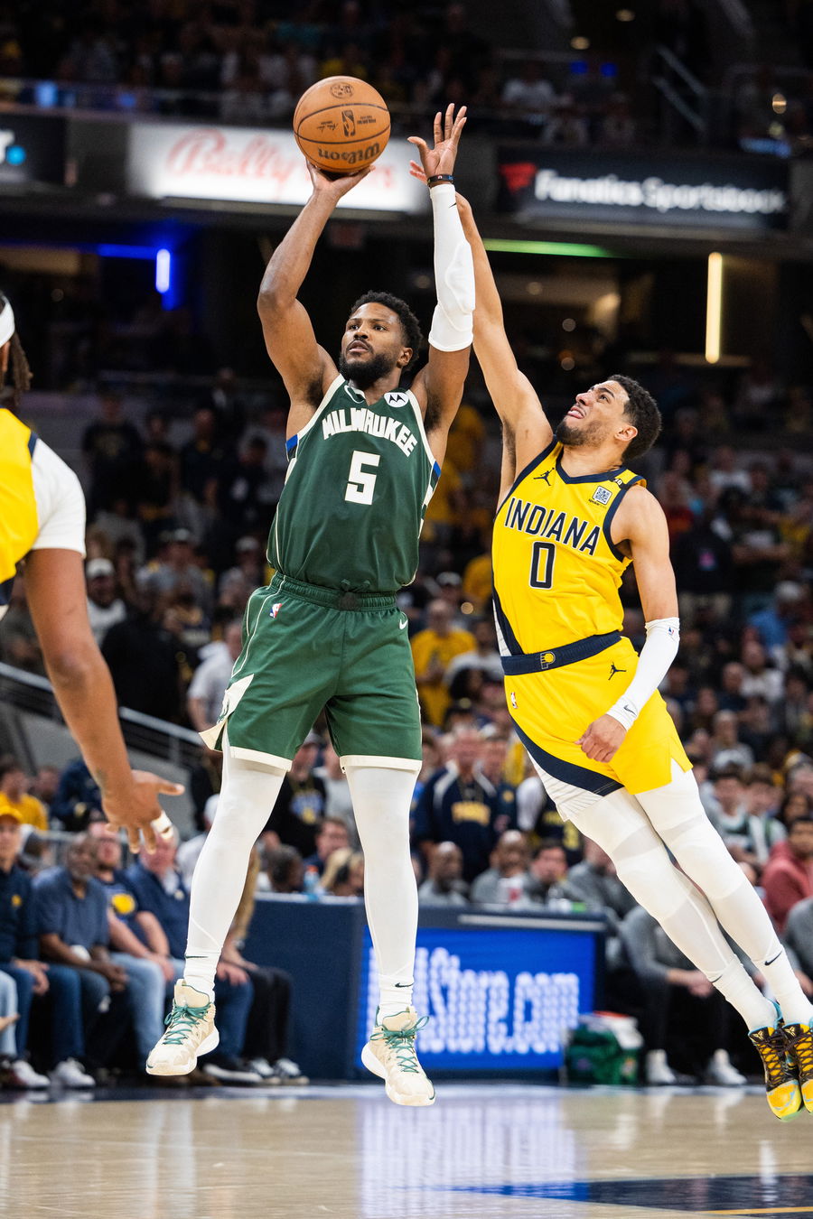Apr 28, 2024; Indianapolis, Indiana, USA; Milwaukee Bucks guard Malik Beasley (5) shoots the ball while Indiana Pacers guard Tyrese Haliburton (0) defends during game four of the first round for the 2024 NBA playoffs at Gainbridge Fieldhouse. Mandatory Credit: Trevor Ruszkowski-USA TODAY Sports