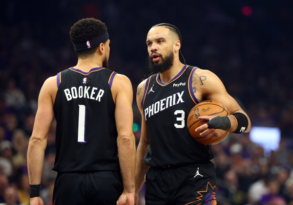 Apr 14, 2026; Phoenix, Arizona, USA; Phoenix Suns forward Dillon Brooks (3) with guard Devin Booker (1) against the Portland Trail Blazers in the first half during the play-in rounds of the 2026 NBA Playoffs at Mortgage Matchup Center. Mandatory Credit: Mark J. Rebilas-Imagn Images