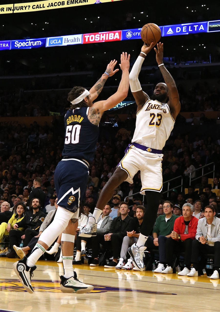 Apr 27, 2024; Los Angeles, California, USA; Los Angeles Lakers forward LeBron James (23) shoots against Denver Nuggets forward Aaron Gordon (50) during the second quarter in game four of the first round for the 2024 NBA playoffs at Crypto.com Arena. Mandatory Credit: Jason Parkhurst-USA TODAY Sports