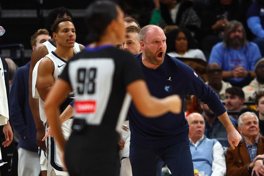 Jan 25, 2025; Memphis, Tennessee, USA; Memphis Grizzlies head coach Taylor Jenkins reacts after a foul during the second quarter against the Utah Jazz at FedExForum. Mandatory Credit: Petre Thomas-Imagn Images
