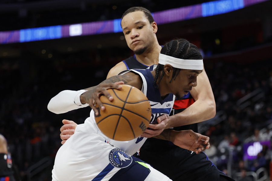 Jan 17, 2024; Detroit, Michigan, USA; Minnesota Timberwolves forward Jaden McDaniels (3) dribbles defended by Detroit Pistons forward Kevin Knox II (24) in the first half at Little Caesars Arena. Mandatory Credit: Rick Osentoski-USA TODAY Sports