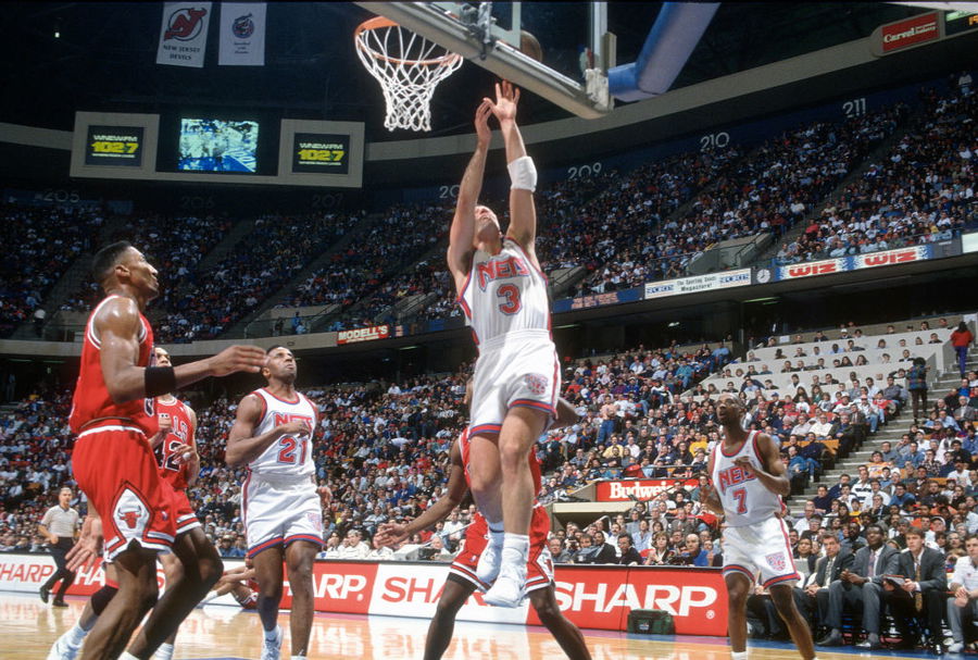 EAST RUTHERFORD, NJ – CIRCA 1993: Drazen Petrovic #3 of the New Jersey Nets goes in for a layup against the Chicago Bulls during an NBA basketball game circa 1993 at the Brendan Byrne Arena in East Rutherford, New Jersey. Petrovic played for the Nets from 1991-93. (Photo by Focus on Sport/Getty Images) *** Local Caption *** Drazen Petrovic