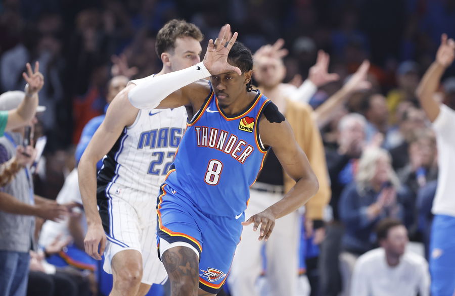 Nov 4, 2024; Oklahoma City, Oklahoma, USA;Oklahoma City Thunder forward Jalen Williams (8) gestures after scoring a three point basket against the Orlando Magic during the first quarter at Paycom Center. Mandatory Credit: Alonzo Adams-Imagn Images