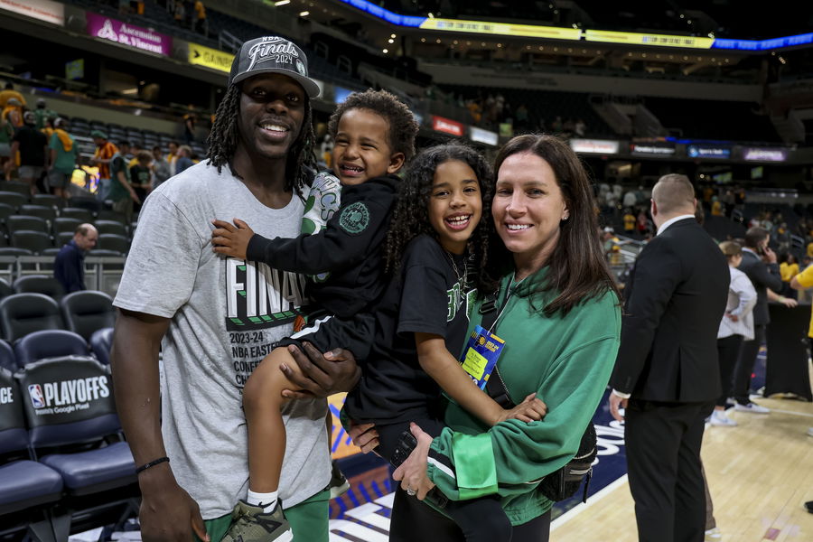 May 27, 2024; Indianapolis, Indiana, USA; Boston Celtics guard Jrue Holiday (4) and his family after the Boston Celtics won game four of the eastern conference finals for the 2024 NBA playoffs at Gainbridge Fieldhouse. Mandatory Credit: Trevor Ruszkowski-USA TODAY Sports