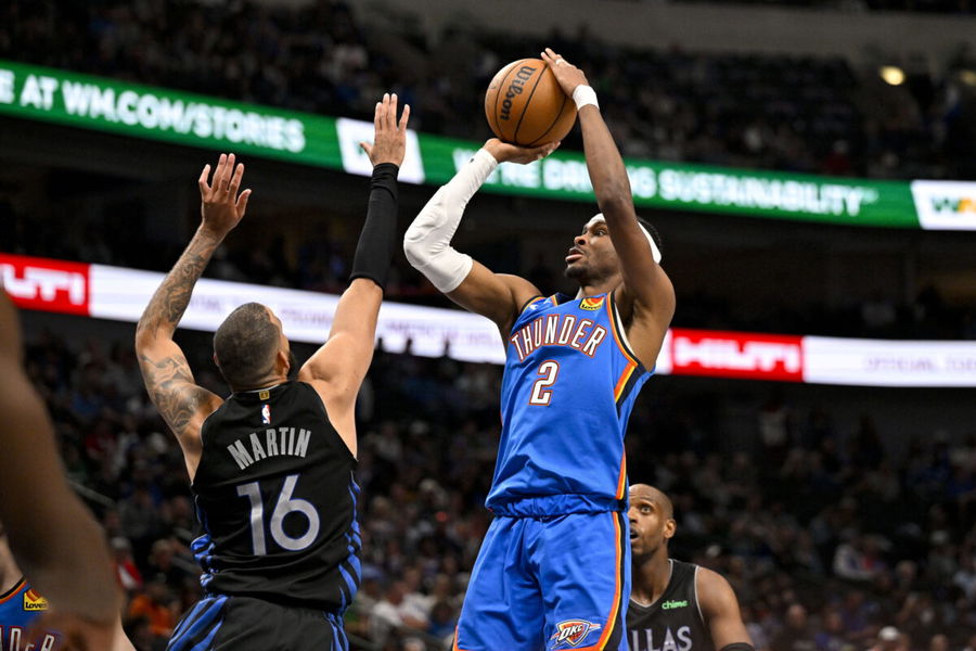 Mar 1, 2026; Dallas, Texas, USA; Oklahoma City Thunder guard Shai Gilgeous-Alexander (2) makes a jump shot over Dallas Mavericks forward Caleb Martin (16) during the game between the Mavericks and the Thunder at American Airlines Center. Mandatory Credit: Jerome Miron-Imagn Images
