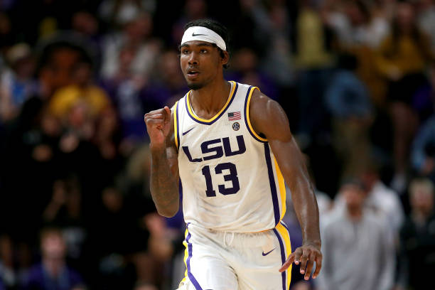 BATON ROUGE, LOUISIANA – FEBRUARY 01: Tari Eason #13 of the LSU Tigers reacts after scoirng during the first half against the Mississippi Rebels at Pete Maravich Assembly Center on February 01, 2022 in Baton Rouge, Louisiana. (Photo by Sean Gardner/Getty Images)