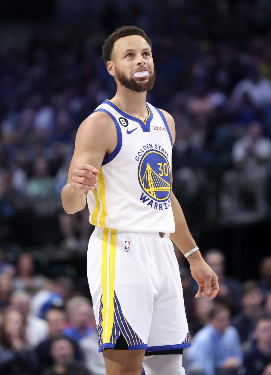 Nov 29, 2022; Dallas, Texas, USA; Golden State Warriors guard Stephen Curry (30) reacts during the first quarter against the Dallas Mavericks at American Airlines Center. Mandatory Credit: Kevin Jairaj-USA TODAY Sports