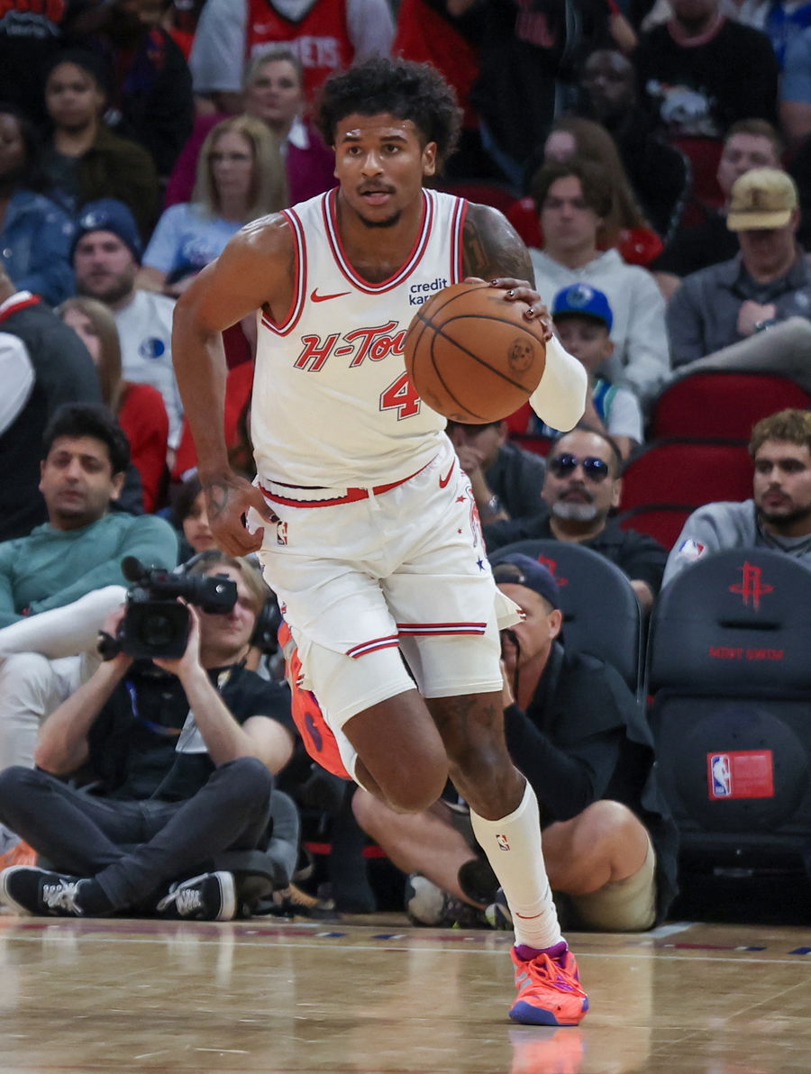 Dec 22, 2023; Houston, Texas, USA; Houston Rockets guard Jalen Green (4) dribbles against the Dallas Mavericks in the first quarter at Toyota Center. Mandatory Credit: Thomas Shea-USA TODAY Sports