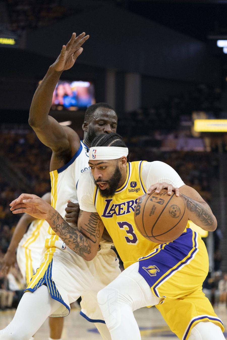NBA, Basketball Herren, USA Playoffs-Los Angeles Lakers at Golden State Warriors May 10, 2023 San Francisco, California, USA Los Angeles Lakers forward Anthony Davis 3 dribbles the basketball against Golden State Warriors forward Draymond Green 23 during the first quarter in game five of the 2023 NBA playoffs conference semifinals round at Chase Center. San Francisco Chase Center California USA, EDITORIAL USE ONLY PUBLICATIONxINxGERxSUIxAUTxONLY Copyright: xKylexTeradax 20230510_kkt_st3_001