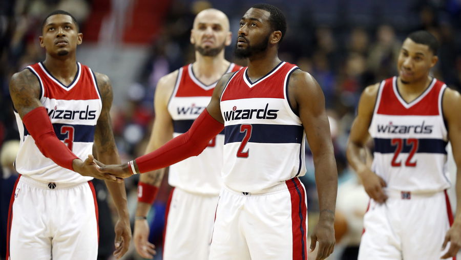 Washington Wizards guard Bradley Beal, left, center Marcin Gortat, from Poland, guard John Wall, and forward Otto Porter Jr. walk on the court after a timeout during the second half of an NBA basketball game against the Atlanta Hawks, Friday, Nov. 4, 2016, in Washington. The Wizards won 95-92. (AP Photo/Alex Brandon)