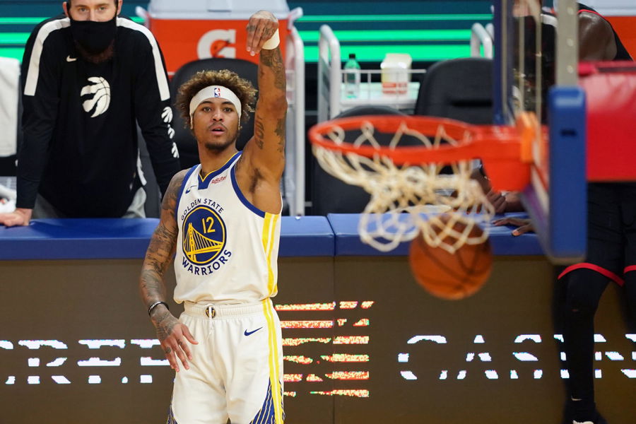Jan 10, 2021; San Francisco, California, USA; Golden State Warriors guard Kelly Oubre Jr. (12) hits a 3-pointer during the fourth quarter against the Toronto Raptors at Chase Center. Mandatory Credit: Darren Yamashita-USA TODAY Sports