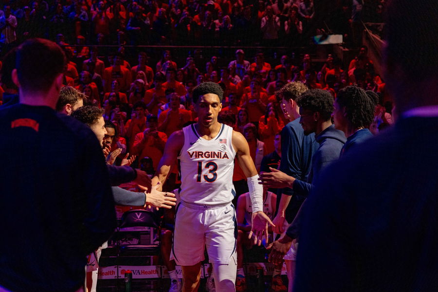 Feb 24, 2024; Charlottesville, Virginia, USA; Virginia Cavaliers guard Ryan Dunn (13) walks out as the starting line up is announced before the game against the North Carolina Tar Heels at John Paul Jones Arena. Mandatory Credit: Hannah Pajewski-USA TODAY Sports