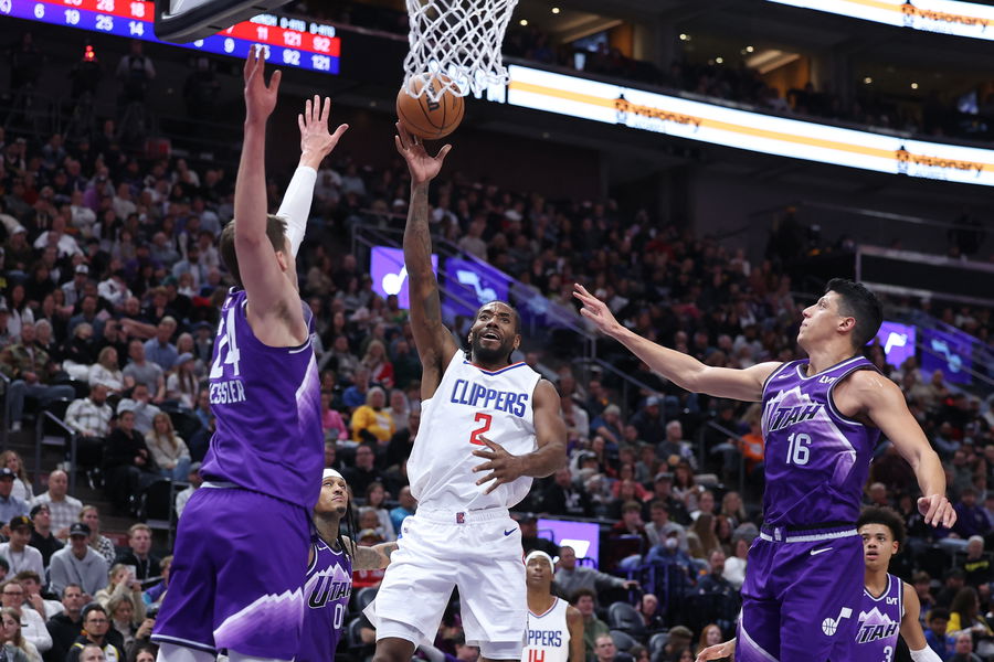 Dec 8, 2023; Salt Lake City, Utah, USA; Los Angeles Clippers forward Kawhi Leonard (2) shoots the ball against Utah Jazz center Walker Kessler (24) and forward Simone Fontecchio (16) during the second half at Delta Center. Mandatory Credit: Rob Gray-USA TODAY Sports