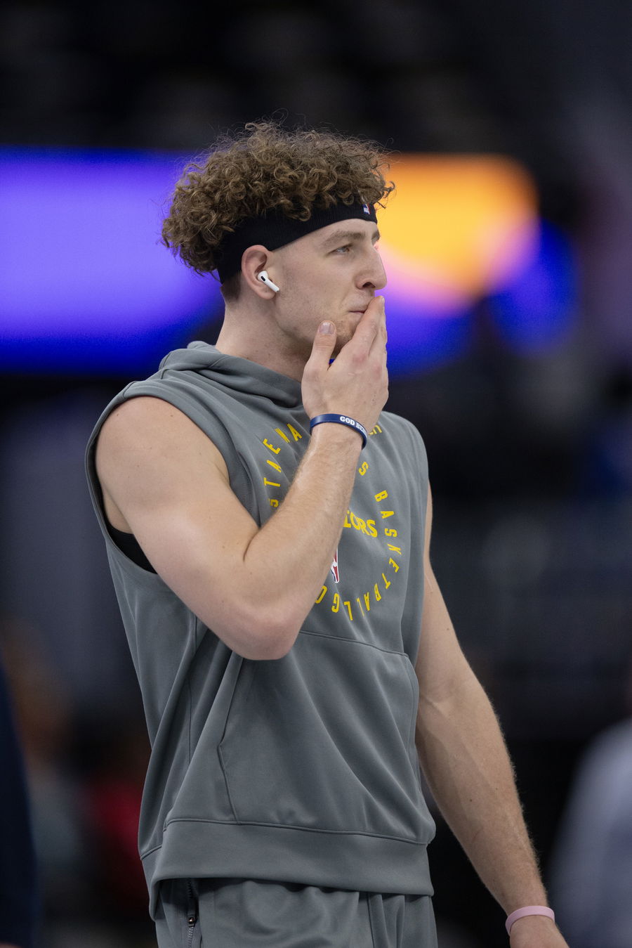 Mar 20, 2024; San Francisco, California, USA; Golden State Warriors guard Brandin Podziemski watches his teammates warm up before facing the Memphis Grizzlies at Chase Center. Mandatory Credit: D. Ross Cameron-Imagn Images
