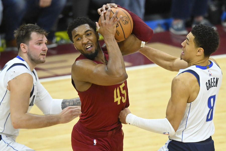 Feb 27, 2024; Cleveland, Ohio, USA; Dallas Mavericks guard Luka Doncic (77) and guard Josh Green (8) defend Cleveland Cavaliers guard Donovan Mitchell (45) in the fourth quarter at Rocket Mortgage FieldHouse. Mandatory Credit: David Richard-USA TODAY Sports