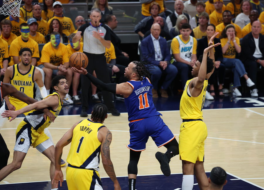 May 25, 2025; Indianapolis, Indiana, USA; New York Knicks guard Jalen Brunson (11) drives to the hoop past Indiana Pacers forward Obi Toppin (1) during the first quarter of game three of the eastern conference finals for the 2025 NBA Playoffs at Gainbridge Fieldhouse. Mandatory Credit: Trevor Ruszkowski-Imagn Images