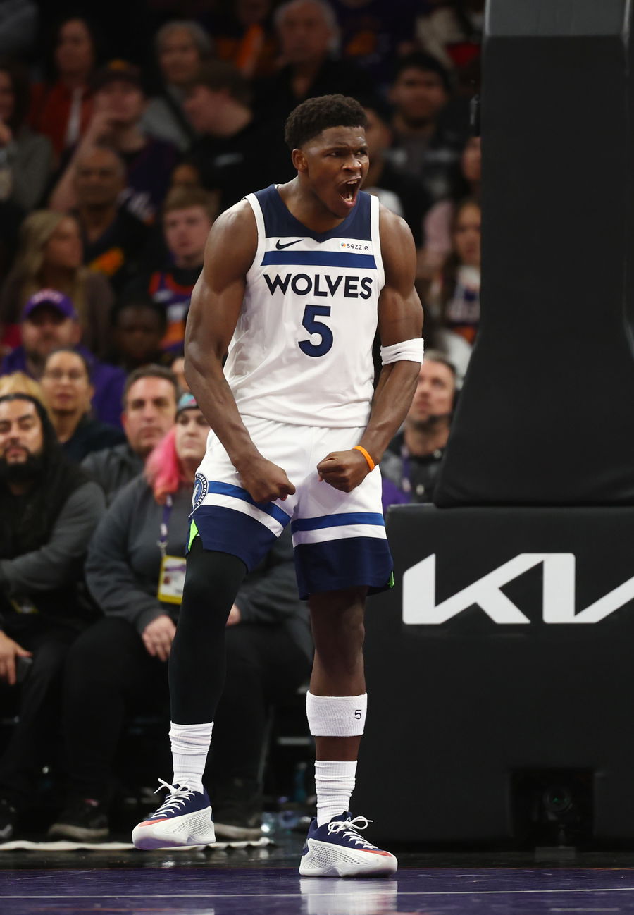 Jan 29, 2025; Phoenix, Arizona, USA; Minnesota Timberwolves guard Anthony Edwards (5) celebrates a play against the Phoenix Suns at Footprint Center. Mandatory Credit: Mark J. Rebilas-Imagn Images