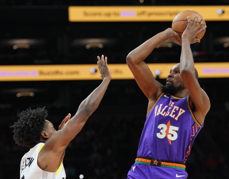 Jan 11, 2025; Phoenix, Arizona, USA; Phoenix Suns forward Kevin Durant (35) shoots over Utah Jazz guard Collin Sexton (2) during the second half at Footprint Center. Mandatory Credit: Joe Camporeale-Imagn Images